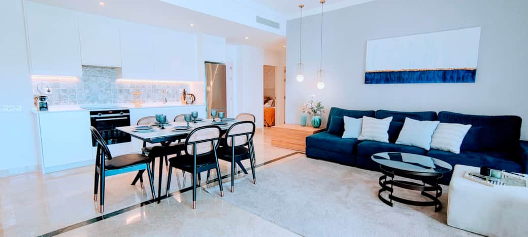 Step inside to discover a bright and airy living space with a fully equipped open-plan kitchen, a comfortable lounge, and large windows leading out to your private, gated terrace with sea views — ideal for children and perfect for enjoying your morning coffee or al fresco dinners.