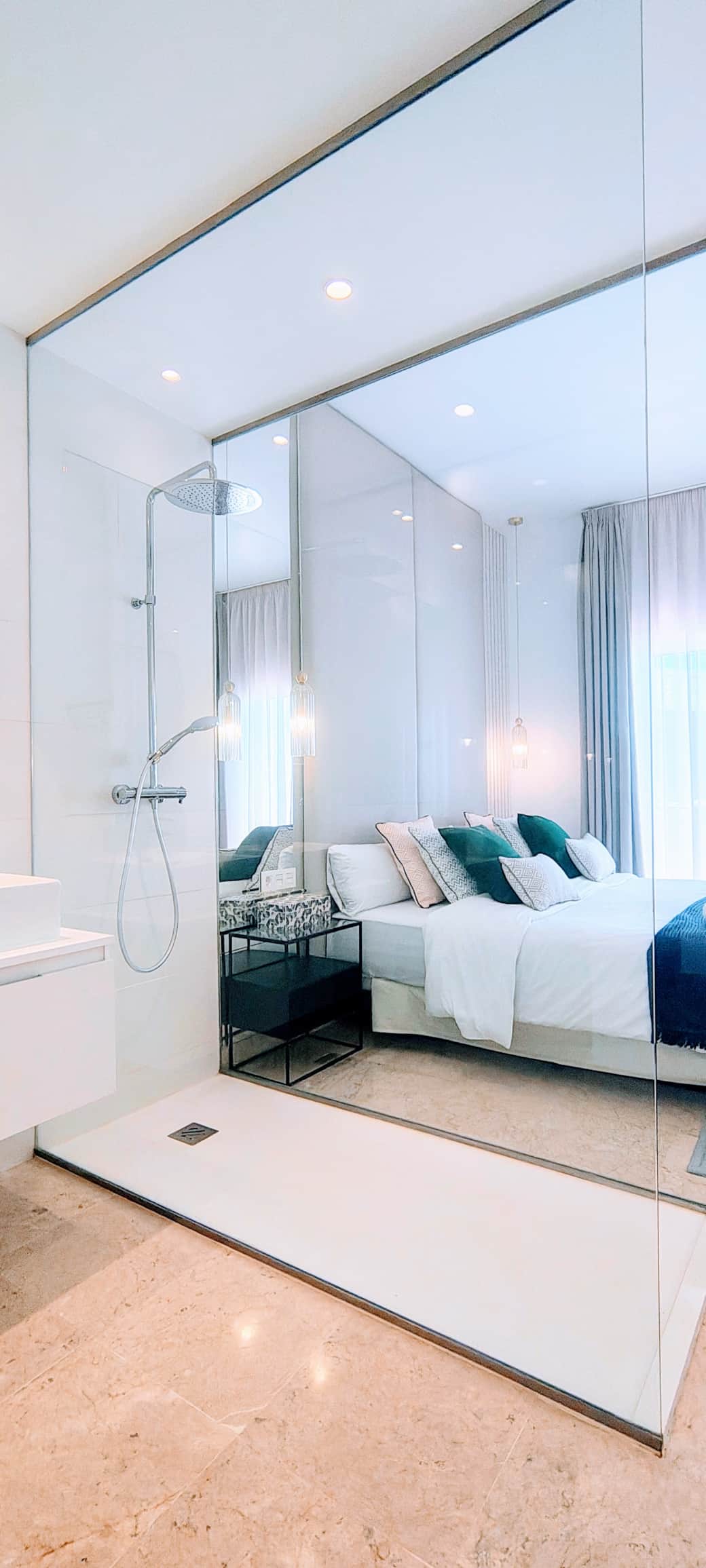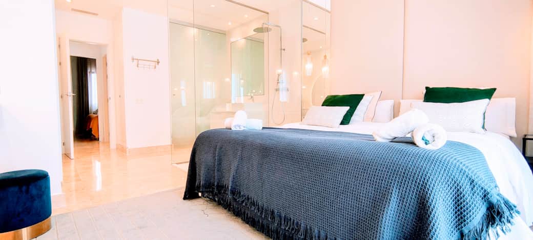 🛏️ The master bedroom features a king-size bed, large built-in wardrobes, and a modern ensuite bathroom with a walk-in shower. Two additional bedrooms, each with twin beds, share a second sleek bathroom. All rooms offer plenty of storage space and benefit from central air conditioning for both cooling ❄️ and heating 🔥.